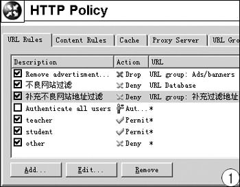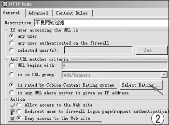 1. 在HTTP Policy中建立一个新规则“不良网站过滤”(如图1所示),然后,双击这个规则进入HTTP Rule设置(如图2所示),在“General”选项卡中有三项需要选择: