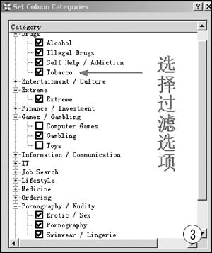 在设置好以上选项后,点击“is rated by Cobion Content Rteing system(使用Cobion分类系统)”后面的[Select Rating…](选择分类)按钮进入“Set Cobion Categories(分类设置)”设置界面(如图3所示)。选择需要过滤的分类,然后点[OK]保存设置。在此我们选择过滤“色情、毒品、赌博”。