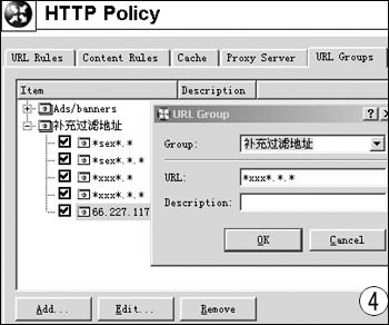 1. 添加地址组(如图4所示)。说明:这里的地址可以是不以“http://”开头的网址和网站目录。可以使用通配符“*”和“?”来表示一组地址。其中:“*”代表可以使任何合法的字符串;“?”代表可以使用任何合法的单个字符。例如:*sex*.*代表所有二级域名中包含“sex”的网址;*/ads/*:代表所有的网站的/ads/目录下的内容。