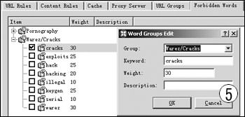 2. 关键字过滤(如图5所示)。说明:“Item”为过滤关键字,它被包含在关键字组里以便进行管理;“Weight”为此字符在页面上出现的次数。“cracks”的“weight”为30就是说在用户浏览的网页中包含30个以上的“cracks”时,此页面就会被禁止。
