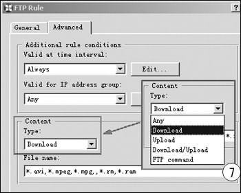 大家可以看到,“Conternt”的“Type”为我们提供了“Any、Download Upload、Download /Upload、FTP command”5种选项,这样我们就可以根据需要选择不同的选项进行限制了。 (出处:中国
