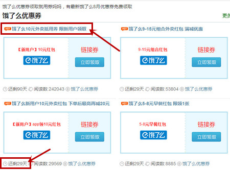 1、打开官网点击链接后,一大片面积的优惠卷都呈现在你面前,找到你想要领取的优惠券后点击它。我们以饿了么为例