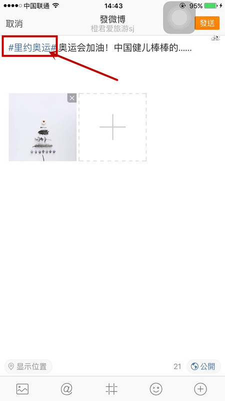不知道怎么加话题?在微博首页上方,就有话题的提示,选择后,我们就可以看到#里约奥运#话题讨论,是不是很简单呀!小编已经亲自用微博试用过咯,发送微博后国旗马上就跟在你的名字后面咯(没有更新的可以刷新试试),大家一起为里约奥运会加油打气吧!