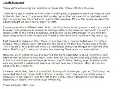 Kalanick,以下简称TK)的博客文章在网上流传,TK在文章中称,“优步中国和滴滴出行在中国都投入了数十亿美元,且两家公司尚未在该市场实现盈利。实现盈利是打造可持续业务的唯一出路,这能够更好的在长期服务于中国乘客、司机和城市,优步中国与滴滴出行的合并能够变得更加强大。”