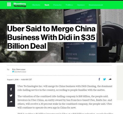 小编也在第一时间援引消息人士报道称,“Uber中国将与滴滴出行合并,合并后Uber将获得合并后公司20%的股份。Uber目前还将继续在中国提供自己的应用。滴滴还将以680亿美元的估值对Uber投资10亿美元。