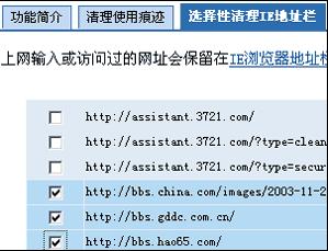 清理IE地址栏里的网址这项功能在清理使用痕迹里就有提供,不过两者是有区别的,清理使用痕迹里提供的是完全清除,不能让网友进行方便的自由取舍。所以为了满足网友有选择的进行IE地址清理,提供了这项功能。在列表当中的网址均是浏览过的记录。网友可以根据需要,在要