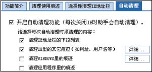 对于不愿麻烦的人来说,每次都要按前面所说的步骤进行清理不被烦死也要累死。所以上网助手提供了这个贴心的功能--自动清理。网友完全可以根据自己的需求,选择每次自动清理时须清理的内容,这样每次关闭IE时助手会自动清理,无需每次亲自动手,是不是很方便?(图3)