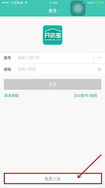 1、首先在手机上下载美团开店宝并安装,打开软件后下方点击“免费入住”。