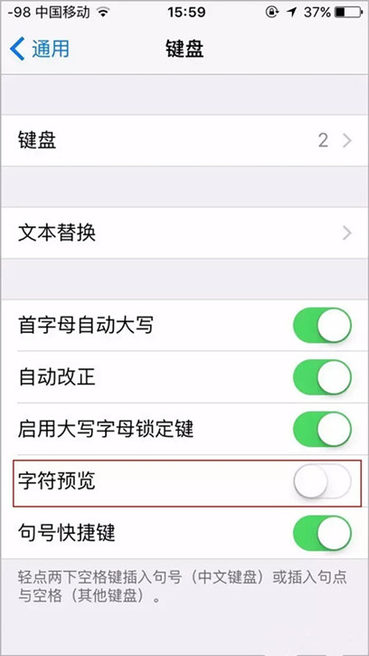 而且经过一段时间,我们对iOS键盘熟悉了之后,其实不太需要这个预览功能,再加上有各种近似的纠错功能,我们可以关掉这个预览开关,增加安全性!