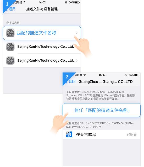 2、PP盘古越狱工具安装成功后,在「设置」-「通用」-「描述文件与设备管理」完成应用信任设置