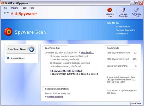 做为软件最主要的功能,Giant AntiSpyware和微软其他产品一样,不论是使用还是设置都是非常简单的,甚至是使用默认的设置都没问题,用国外网站编辑的话来说就是:“只要你进行简单的设置并扫描一次你的系统之后,你将不会再在你的系统里看到任何间谍软件!”