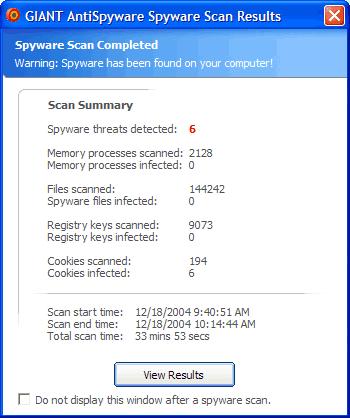 Giant AntiSpyware的扫描结果信息很详细,只不过看起来扫描14万个文件所用的时间似乎挺长的,总共花了半个小时。