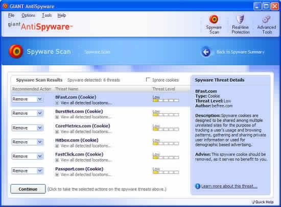 除此之外Giant AntiSpyware对Cookies中可能会侵犯到用户隐私的站点监控很严格,碰到可疑的站点时会提醒用户忽略该站点、检测该站点是否存在威胁或者直接