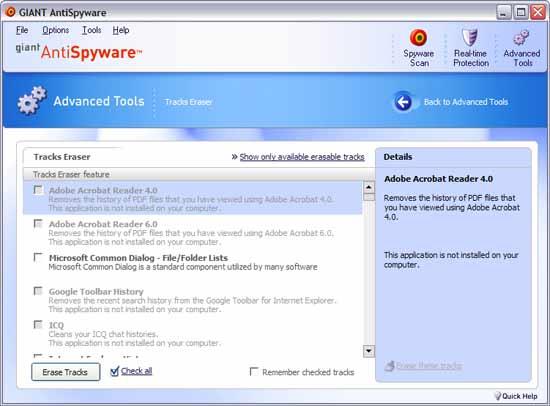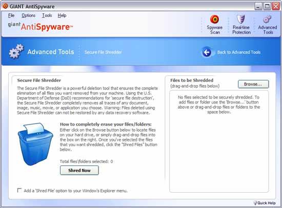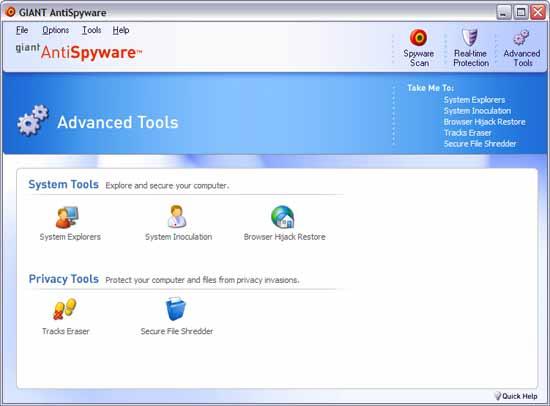 除了上面的两大反间谍常用的功能之外,Giant AntiSpyware还带来了一些实用的工具:System Explorers、System Inoculation、Browser Hijack Restore、Tracks Eraser和Secure File Shredder。