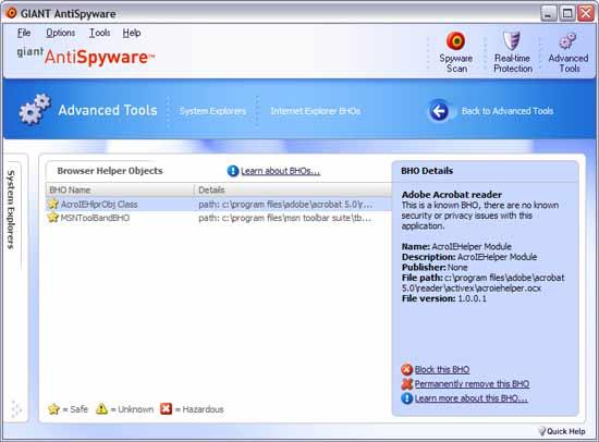 System Explorer里的Browser Helper Objects(BHO)可以检测当前系统里安装的Internet Explorer辅助插件,并用简单明了的图释来告诉用户该插件是安全的还是危险的,若是危险的,用户可以轻松地将其阻止或删除。