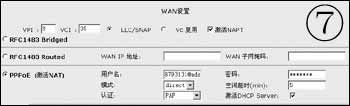 1. 点击图5中的“WAN设置”,将出现如图6画面。在“VPI”框中填入8,“VCI”中填35(8/35为网管用)如图7所示。