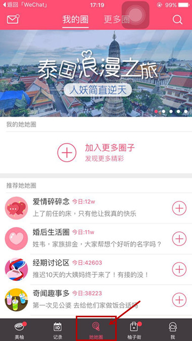5、点击“她她圈”,然后我们可以看到里面有很多类似话题的讨论群