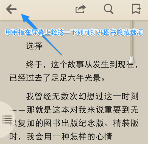 要想返回图片目录或是QQ阅读的书架的话,请用手指在屏幕上轻按一下。当隐藏选项出来以后,点击屏幕左侧的目录图标可以返回图书目录,如图所示