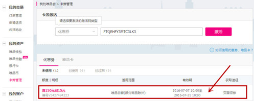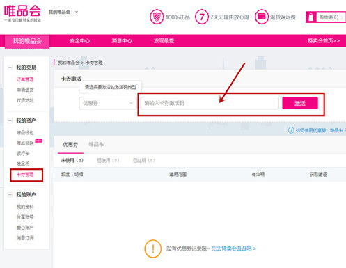 进入唯品会官方网站,依次点开“我的唯品会”——“卡卷管理”,粘贴激活码