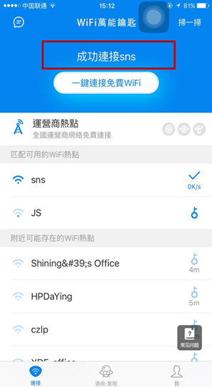 wifi万能钥匙连接可以破解的wifi密码,如图已经成功连接