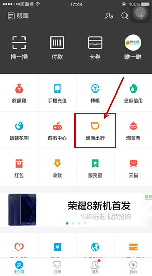 第一步:利用支付宝付款(打开支付宝界面,进入滴滴出行),如图所示;