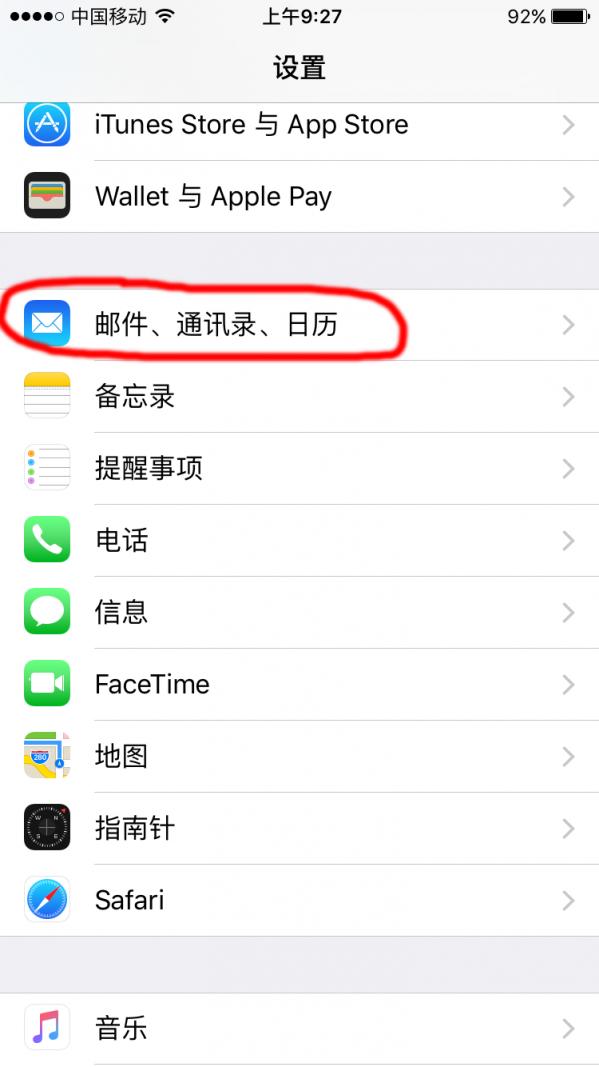 打开iphone 设置----邮件、通讯录、日志