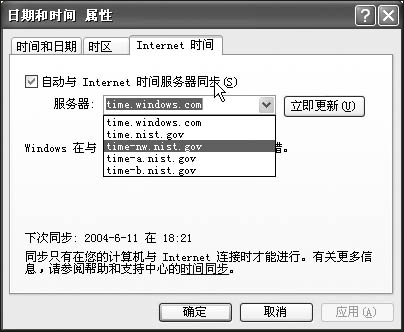 关闭注册表编辑器后,用鼠标双击任务栏右下角的时间显示区域,打开“日期和时间属性”窗口,切换到“Internet时间”选项卡,再单击服务器列表,在下拉窗口就会出现五个时间服务器地址,如图所示。单击任意地址进行