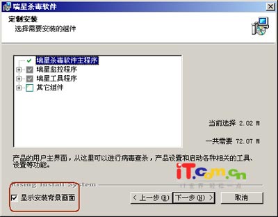 读者朋友可以从~~~~~~~~~~~~~~~下载,安装过程非常简单,对计算机不太熟悉的用户就可以使用默认安装即可完成(如图1),而且在安装中瑞星新增加了“显示背景画面”选择提示框,这样更方便安装。在安装瑞星杀毒2005前需要
