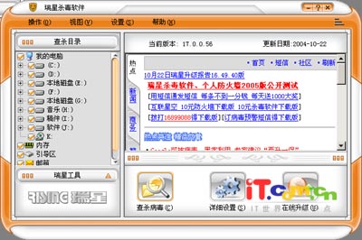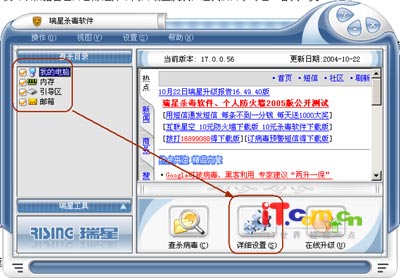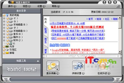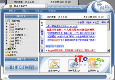 S。H。E的Super Star可以说是唱遍了大街小巷,读者朋友可能对这个歌曲也是耳熟能详,瑞星杀毒2005在杀毒这个方面也可以说是个“Super Star”。瑞星2005采用了“三重病毒分析过滤技术,它在使用传统的特征值扫描技术的基础上,又增加了瑞星独有的行为模式分析(BMAT)和脚本判定(SVM)两项查杀病毒技术。检测内容经过三重检测和分析,既能通过特征值查出已知病毒,又可以通过程序分析出未知的病毒。三个杀毒引擎相互配合,从根本上保证了系统的安全,使用瑞星杀毒2005对电脑进行病毒检测的方法也很简单。