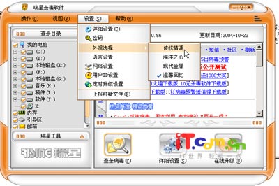 如果想更换目前的皮肤可以启动瑞星杀毒2005以后点击“设置”→“外观选择”(如图5),选择适合自己个性的皮肤。