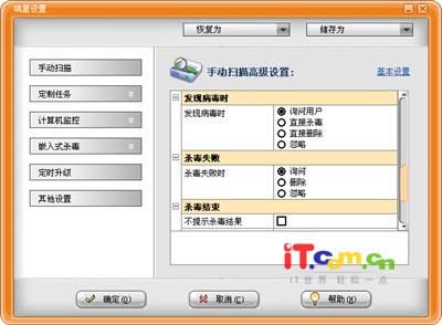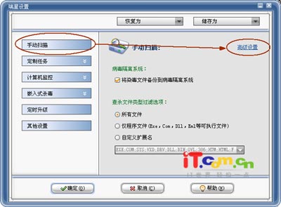 步骤2 点击“详细设置”打开瑞星设置对话框,选择“手动扫描”→“高级设置”(如图7)。