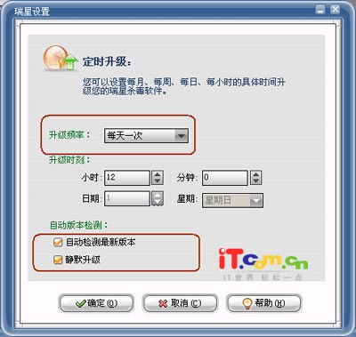 小提示:在定时升级的对话框中一定要选择“自动检测新版本”,这样才可以进行定时升级。还可以选中“静默升级”,这样杀毒软件的病毒库下载完成后就可以自动在后台安装,非常地方便(如图11)。