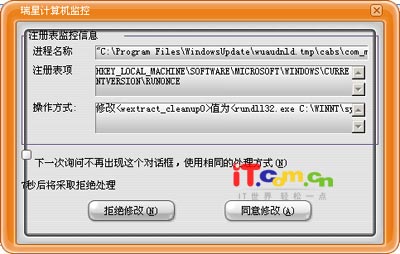 小提示:在新版瑞星中添加了“注册表监控”功能,这样如果是有恶意的网页或者病毒再想偷偷地修改我们的注册表那就不可能了,瑞星回帮我们提示注册表的改动,让我们做到“明察秋毫”。用鼠标右键点击任务栏中的瑞星图标,选择“注册表监控列表”就可以打开列表(如图9)。
