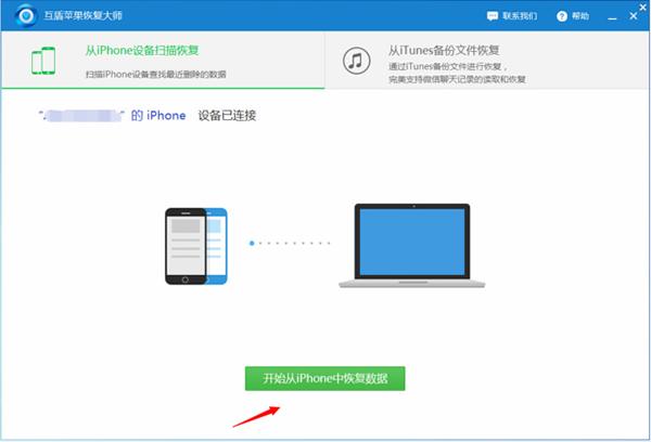 2、将手机连接电脑,在软件界面出现已连接提示后,点击“开始从iPhone设备恢复数据”这边软件会自动备份手机中的照片、微信聊天记录、联系人、和手机删除的短信等。