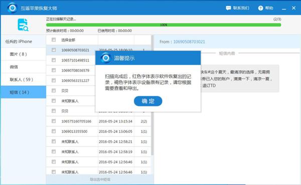 5、最后就是选择需要恢复的手机短信了,一般情况下互盾苹果恢复大师会将很久之前删除的手机短信都扫描出来,但是具体是哪个我们可以在左侧的联系方式中选择需要恢复的短信,也可以把删除的短信全部恢复出来然后选择都是可以的。