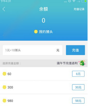 在小猪直播中,你可以点击我的按钮进入到个人中心界面中,后点击猪头充值,如上图所示,1元=10猪头,可以直接选择充值多少钱,或者直接选择下面的猪头充值金额,6元60个猪头,30元300个猪头,按照1:10的比例进行充值进行即可!
