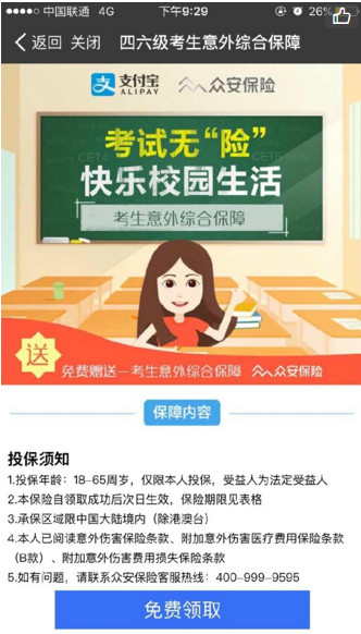 众安保险在支付宝-校园生活里给广大考生限量提供100万份考试险。在新版支付宝-校园生活中认证过的在校生都可以免费领取。领取这份保险的同学,如果因备考期的意外导致缺考,可以得到保险公司的赔偿。