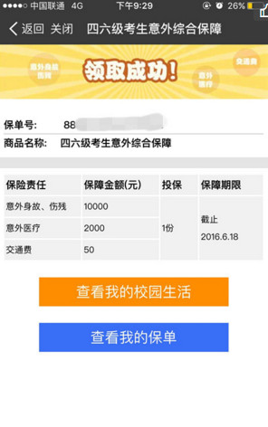 2.进入校园生活,找到四六级考生意外综合保险,点击免费领取
