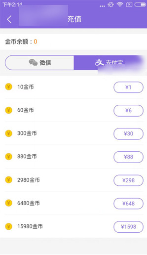 3、在充值页面可以看到1块钱可以购买10个金币。支付方式可以选择微信或者支付宝支付。
