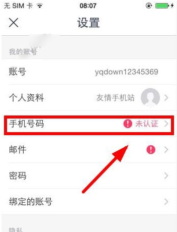 3、然后,在设置的界面,点击手机号码认证的界面!