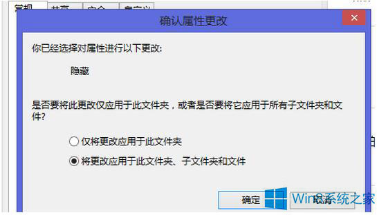 5、然后会弹出一个确认窗口,确认是否将改动适用于当前文件夹下的所有文件和文件夹。当然确定。然后你就会发现你的baidu文件夹看不到了。