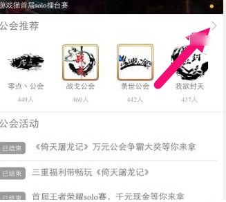 2、然后点击公会推荐的最后按钮“>”,你可以自行搜索各种公会