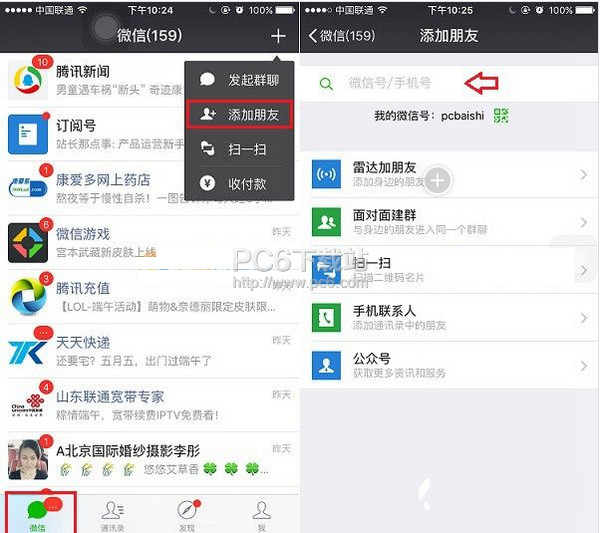 1、首先打开微信,然后点击右上角“+”,再选择“添加好友”