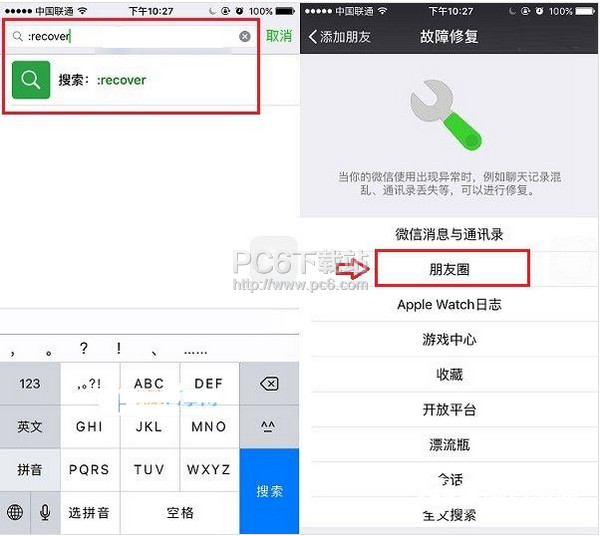 2、然后在添加朋友的搜索框里输入「:recover」 ,然后点击“搜索”,之后就可以进入微信修复功能界面了