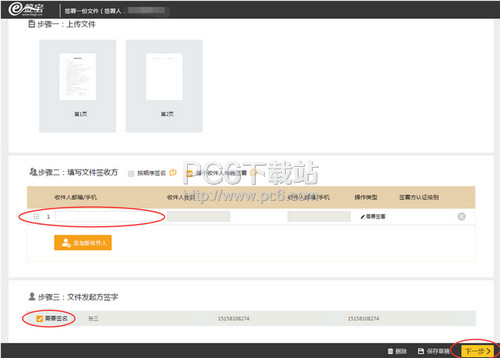 3、填写文件签收人的邮箱或手机,若需要添加多人,可以点击【添加新收件人】进行联系人的添加,发起文件签署时,默认需要自己的签名, 若不需要自己签署,可以取消“需要签名”前面的√,完成联系人的添加,确认上传的文件无误,点击【下一步】;