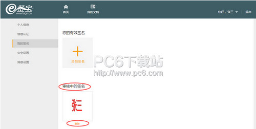 印章上传成功后,可以在我的签名中的“审核中的签名”查看,点击【删除】按钮可以删除此印章;