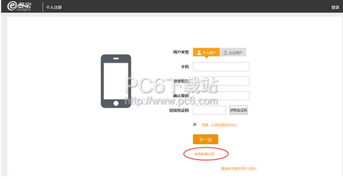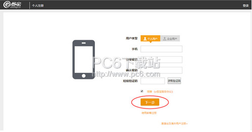 2、点击【个人用户】,默认使用手机号注册,输入手机号、登录密码、短信验证码,点击【下一步】;