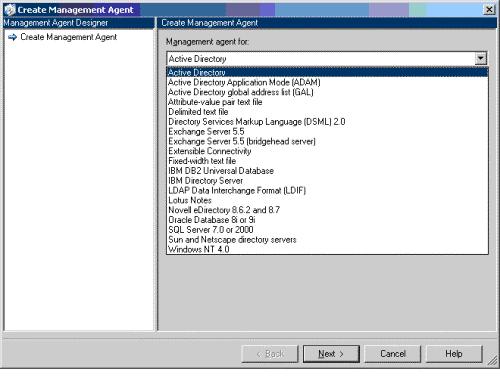 管理代理是MIIS活力的源泉。它们管理连接器空间,并配置进入Metaverse的数据。要创建新的管理代理,点击工具条上的管理代理按钮,并从动作菜单中选择"创建"项。从下图的管理代理设置对话框中,您可以看到有许多种管理代理可供选择。
