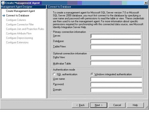 在本例中,您需要创建两个管理代理:一个用于控制进入Metaverse的HumanResourceData对象的数据,另一个则是控制流出HumanResourceData对象的数据。由于您还要从SQL Server 2000数据库中移入和移出数据,所以您还得创建SQL Server管理代理。