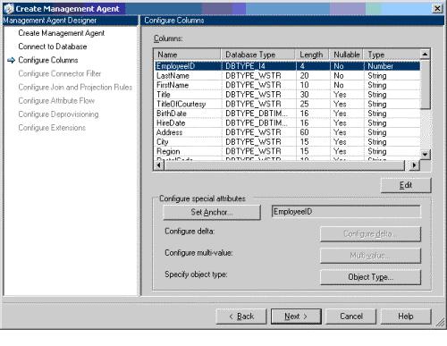 如果您选择集成身份验证,就必须输入用户名和域。当您设置好数据库信息,MIIS管理代理就从表设置中读取信息,并在连接器空间中设置合适的信息。下图的对话框显示了表中的列设置信息。